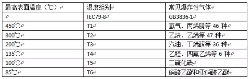 這是與氣體點燃溫度有關的電氣設備(假定環境溫度為40℃時)的最高表面溫度,點燃能量與點燃溫度無關。在標準BS5345第一部分中列出了所有可燃性氣體和其組別。