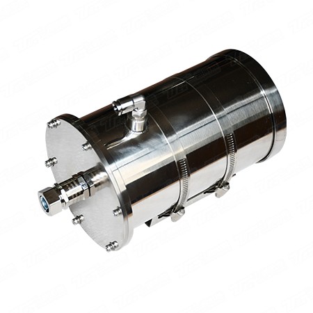 產品描述   ² YTS-A10水冷耐高溫攝像儀是一款專為特殊環境設計的產品。該產品可以應用在環境溫度較高的環境中。   ² 防護罩外層具備水腔,從后端進水口輸入冷卻水,通過水腔從上端的出口排出,防止粉塵粘附,同時循環水可以帶走熱量,有效降低設備的溫度。   ² 視窗采用特殊的鋼化平板玻璃制作,在堅固耐用的同時,保證了畫質的清晰。   ² 具備2個出線孔,可使用防爆撓性管或防爆電纜進行防爆電氣連接。   ² 安裝方便,維護簡單,可選用半固定云臺、固定支架、基座、立柱、塔架方式安裝。
